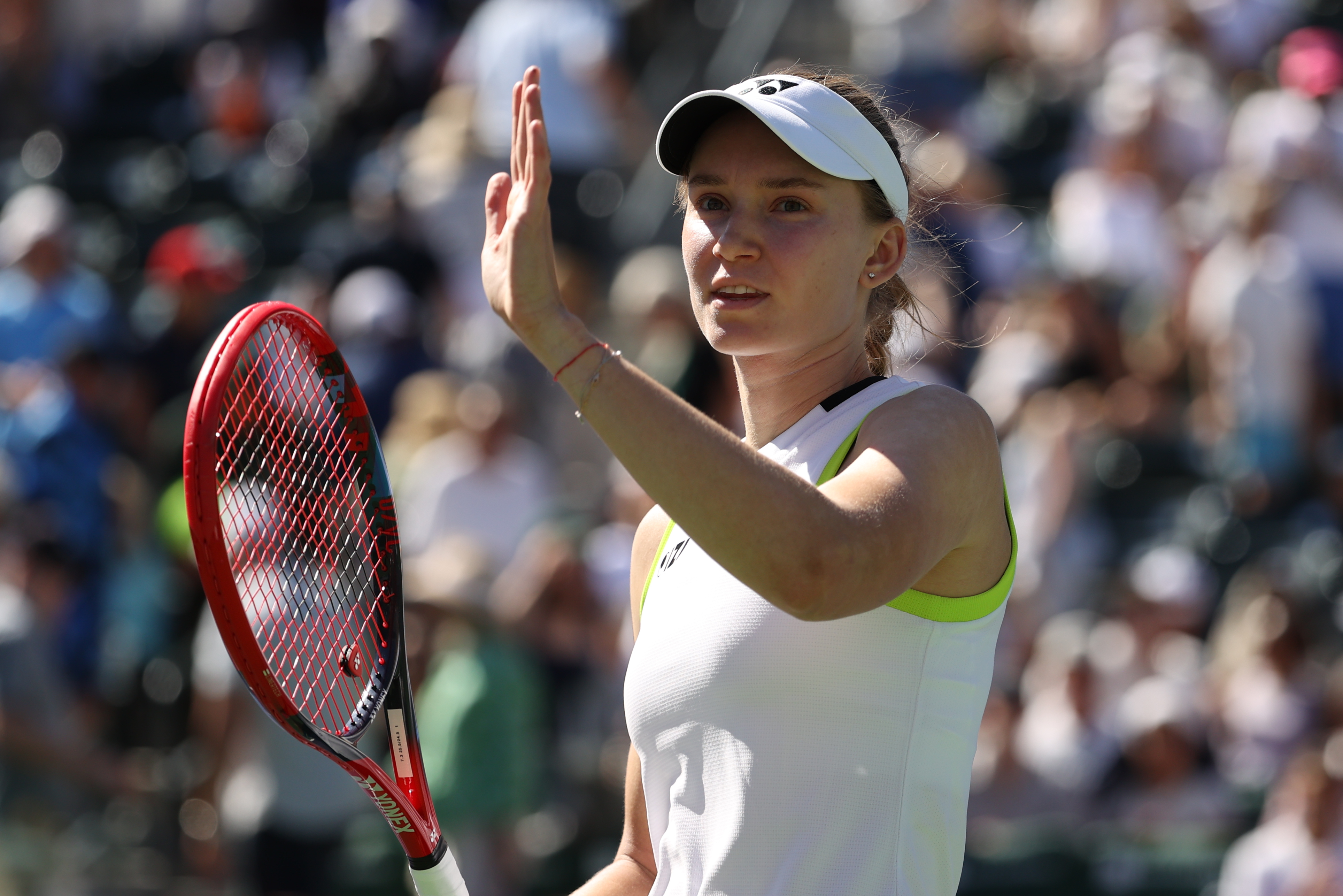 ELENA RYBAKINA: Thank you. Yeah, difficult first match. Hailey played really well. She served good. Yeah, it was not easy.